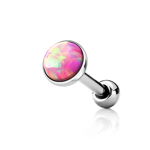 These 16 gauge cartilage barbells are made from 316L stainless steel with external threading. The opal end is fixed to the barbell. Only the 3mm ball end is removable. Choose your synthetic opal size and color below.